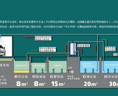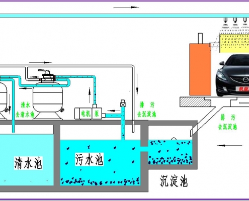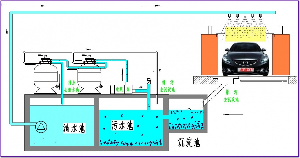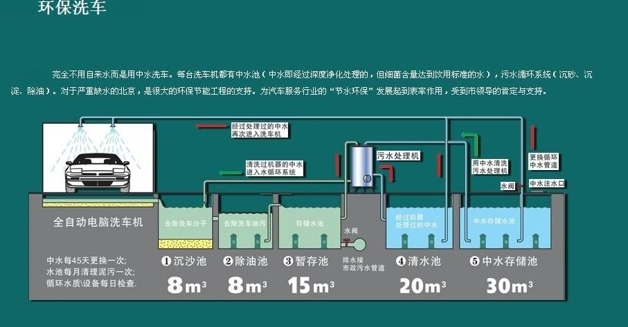 - 洗車循環(huán)水系統(tǒng)UItraCIean 在回收水方面將變得輕松經(jīng)濟,洗車后廢水流入初沉淀池,大顆粒物體在此驚醒絮凝沉淀