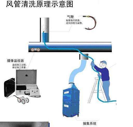 一、直接吸塵法(適合大、中型矩形風管)拆除各種風口 → 專業單位測定風管內積塵情況 → 放入檢查機器人觀察風管內部情況,確定清洗方案(可制作光盤) → 放入清掃機器人打松積塵 → 放入吸塵機器人吸走灰塵 → 放入噴霧消毒機器人噴灑消毒劑 → 放入檢查機器人觀察風管清洗后情況(可制作光盤) → 專業單位測定風管清洗后情況 → 安裝各種風口 → 出具清洗完工報告。 二、揚塵吸塵法(適合中、小型矩形風管)拆除各種風口 → 專業單位測定風管內積塵情況 → 放入檢查機器人 → 觀察風管內部情況,確定清洗方案(可制作光盤) → 在需清洗的風管二頭放置二個氣囊并于其中一邊開一個圓形工藝孔,并把該孔與捕集器的吸入口用軟管聯接 → 再在另一邊放入清掃機器人邊走邊打松灰塵由捕集器同時把灰塵吸走 → 放入噴霧消毒機器人噴灑消毒劑 → 放入檢查機器人觀察風管清洗后情況(可制作光盤) → 專業單位測定風管清洗后情況 → 安裝各種風口 → 出具清洗完工報告。